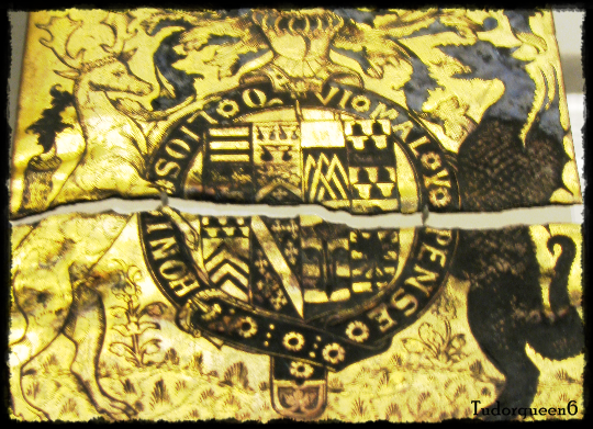 Garter stall plate of William Parr, 1st Marquess of Northampton, 1552. The plate was in St. George’s Chapel, Windsor Castle, among other Garter plates, but upon the ascension of Queen Mary, Parr was stripped of his titles. His stall plate was taken down and broken apart.