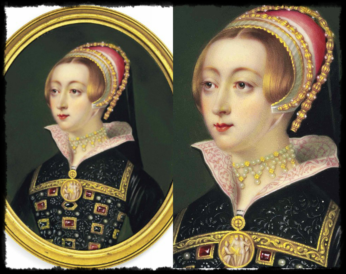 Weir states: “actually it’s a carcanet, or choker, and it’s very distinctive, and in fact unique in Tudor portraits of this period – is identical to the one in the portrait said to be Elizabeth (above, right). It’s almost certainly the same one, and fits a description of a carcanet listed in the Queen’s inventory.” To which I ask… which inventory of Queen Katherine? The inventory listed in Janel Mueller’s compilation of Katherine Parr’s works and correspondences has no mention of the carcanet.