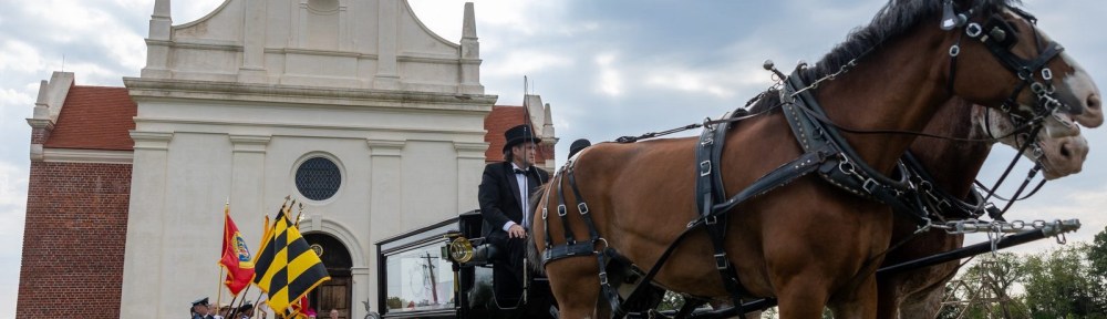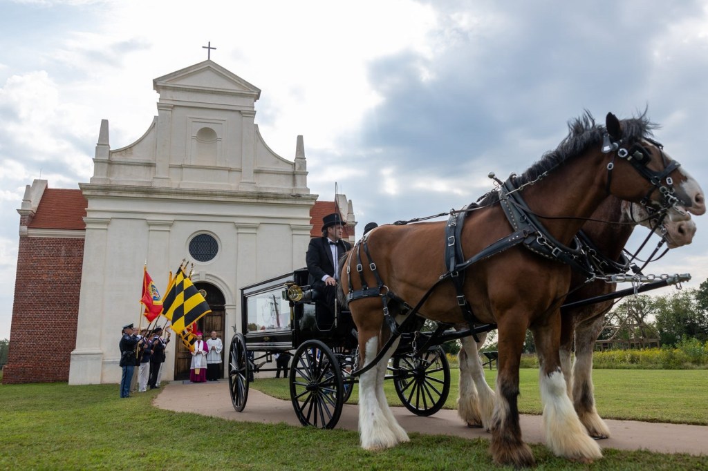 The hearse bearing the remains of eight young children from colonial-era Maryland arrives at the rebuilt 1667 Brick Chapel in Historic St. Mary’s City on Sept. 20, 2025 after being pulled by two Clydesdale horses in a procession from the reconstructed State House of 1676. Baltimore Archbishop William E. Lori, who presided at a reinterment ceremony at the Brick Chapel, can be seen in the background waiting at the chapel’s entrance. The Brick Chapel stands as a landmark of faith that symbolizes Maryland’s status as a birthplace of religious freedom in the United States. (Catholic Standard photo by Mihoko Owada)