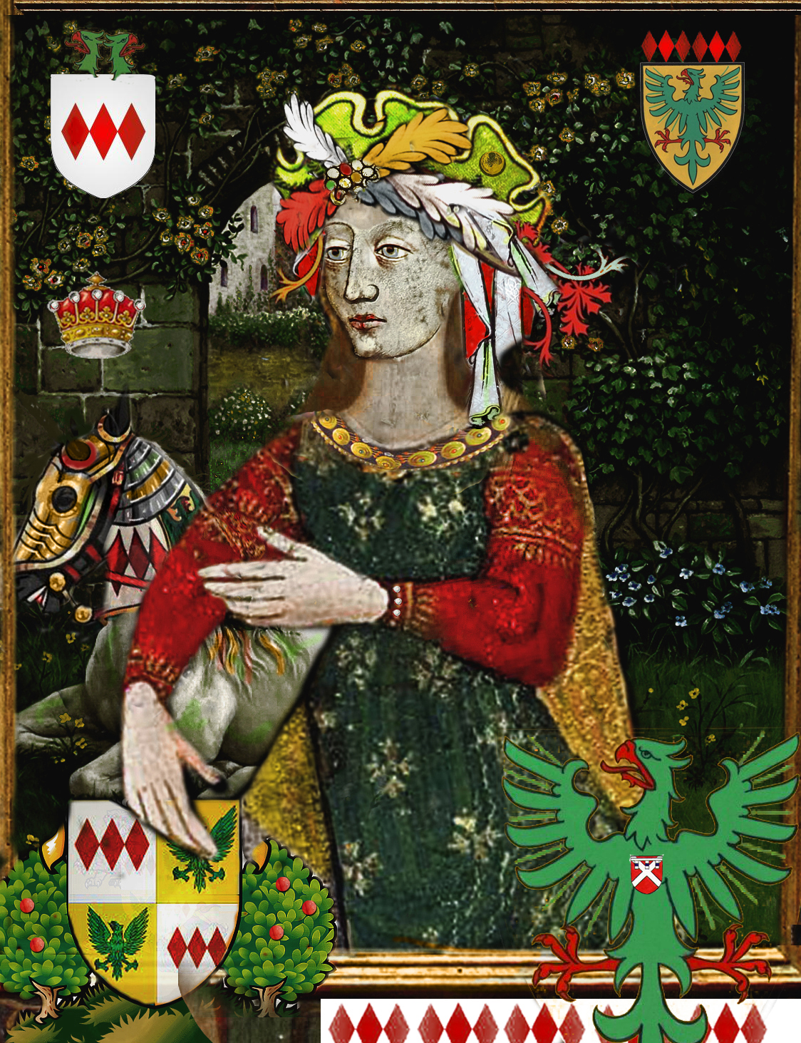 Joan of Kent, Countess of Kent, Baroness Wake of Liddell, and Princess of Wales. The Montacute arms (bottom left) represent her forced marriage to the 2nd Earl of Salisbury; above Montacute is that of the Prince of Wales; and above both is that of the Holland family. In the top right corner — is her mother’s family crest, Wake of Liddell and below that of her father Prince Edmund of Woodstock.