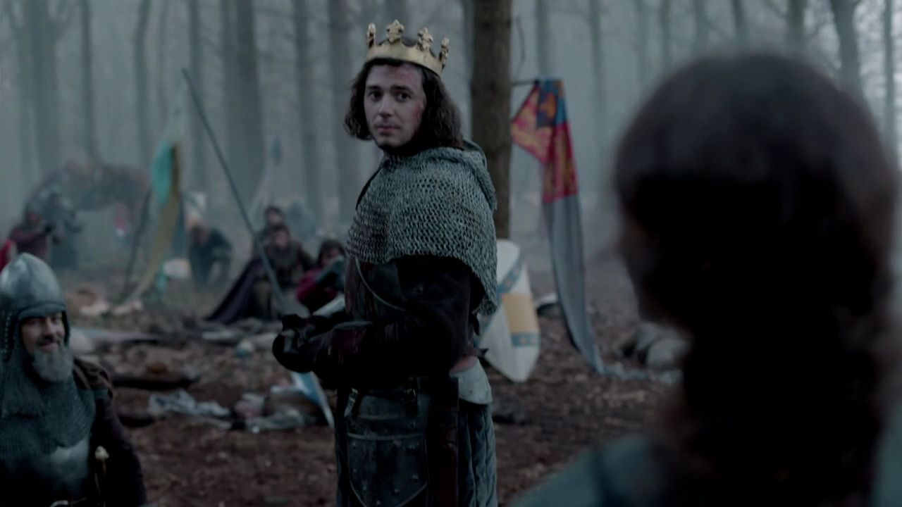 “The White Queen”, BBC. Lord Stanley offers the crown to Henry Tudor. Lady Margaret stands on the battlefield to see her son crowned.