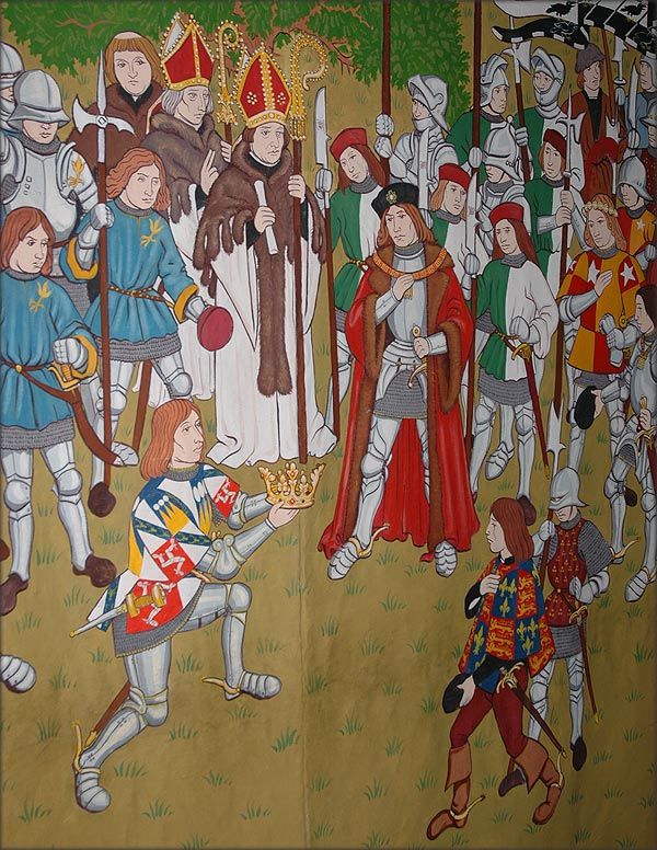 Stanley offers the crown to Henry of Richmond on the battlefield.