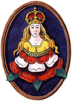 The Parr badge created by Queen Catherine after she became Queen. It represents her patron saint rising from a Tudor rose. Catherine’s patron saint was Saint Catherine of Alexandria also known as Saint Catherine of the Wheel; Catherine Parr used her depiction as part of her royal emblem of a maiden with flowing blonde hair blooming from a Tudor Rose.