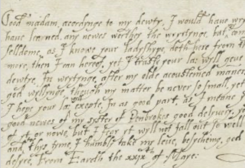 Good madame, I am to craue pardon of you for not wryteinge by my lordes man Harry Grace, the causse I wylled hym to declare to your Ladyship whych was the extremty that my syster of Pembroke was In, at that tyme whych hath contenued tell theursdaye Laste, sethensse that daye she hath ben out of her soundynge, but not able to stand or gooe, her greatest gryf Is nowe want of slepe, and not able to away wyth the syght of meat, but consederynge her estat befor, we thynke our selfes hapy of thys change, hopenng that better wyll followe shortely, the Quynes Majesty hath ben here wyth her tywss, very latt both tymes, and last tyme, yt was x of the cloke at nyght or ever her Majesty whent hensse, being so great a myste, as ther were dyueres of the barges and Boottes that wayted of her loste ther wayes, and landed In wronge plases, but thankes be to god her Majesty came well home wythout colde or feare, for the holdyng of the Prograce, I am ssure your Ladyship hereth for my part I can wryt noe sertaynte, but as I am In all other matteres, as I haue alwayes professed and as dewtye doth bynd me, ready at your Ladyship’s comandement, and In any thynge I maye showe yt ether at thys tyme, or when occassyon seruet[h] yf I be not as wyllynge therto as any chylde of your owne, then lett me be condemened accordynge to my desertes, otherwyss I humbly craue your Ladyship’s good openyon of me not to decreasse, rememberynge your Ladyship’s comandement here to for to wryt to you as often as I coulde, whych nowe In thys plase I shall haue better meanes then I haue had In the country, and ther vpon pressumyng, to lengthen my letter vpon any occassyon, although I count thys of my syster very evell newes yet consederynge, her recouery, I hope my longe scryblynge, wyll the lesse trouble your Ladyship and so wyth my moste humble dewty to my Lorde and your Ladyship I humbly take my leue From Baynardes Castell the viijth of Maye:
