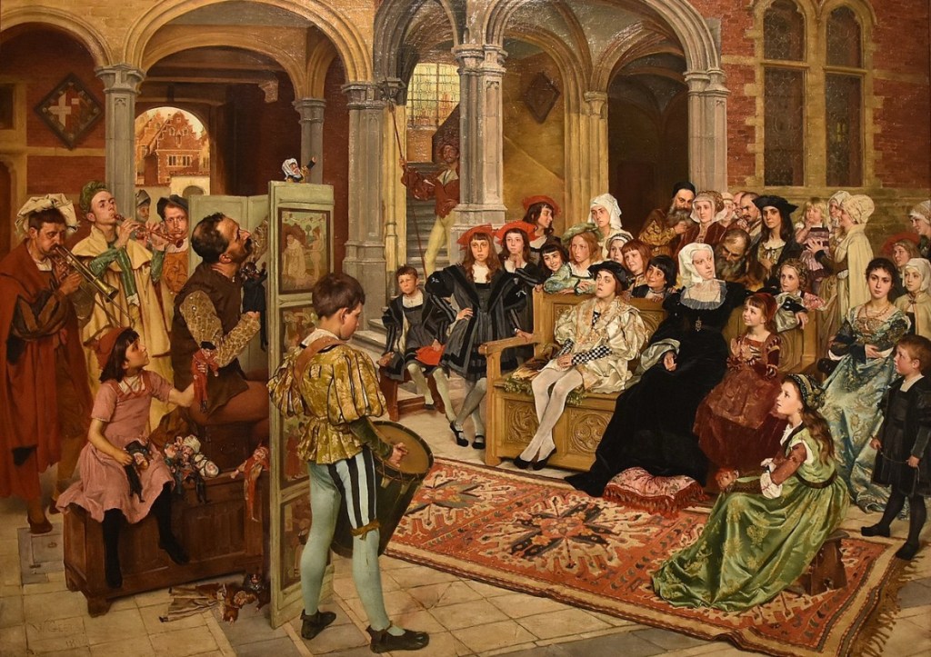 Willem Geets imagines (1892) a puppet show at Margaret’s court; the future Charles V sits next to her, with his sisters alongside.