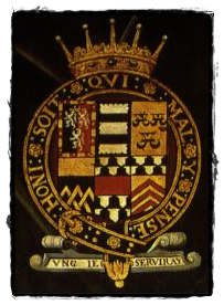Coat of arms relating to those mentioned below who are members of, descendants of, or married into the Holland family. L to R: Mortimer, 2nd Earl of Kent, 1st Duke of York, 3rd Earl of Cambridge, Duke of Clarence, 3rd Duke of Lancaster, 16th Earl of Warwick