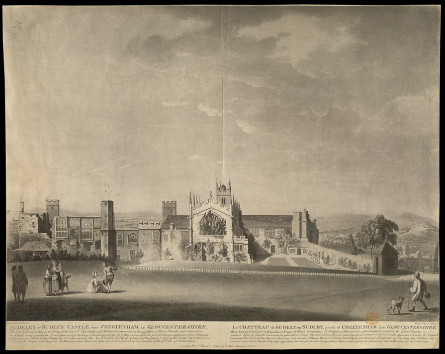 View of the back of Sudeley Castle in Gloucestershire showing the landscape it overlooks. Sudeley is one of the grandest late medieval houses in Gloucestershire. Many of the buildings are ruined but the long medieval hall appears habitable. The Castle Chapel is striking, very much in the Gothic Perpendicular style with heavily pinnacled roof. It has a Royal connection, as Katherine Parr, the last Queen of Henry VIII died here in 1548 and was buried in this Chapel. The large rear window of the chapel is obscured by foliage, which suggests that the Chapel was at this date in a bad state of repair. Between 1554 and 1813, it was held by the Chandos family, although it was damaged during the Civil War, which made it largely inhabitable.