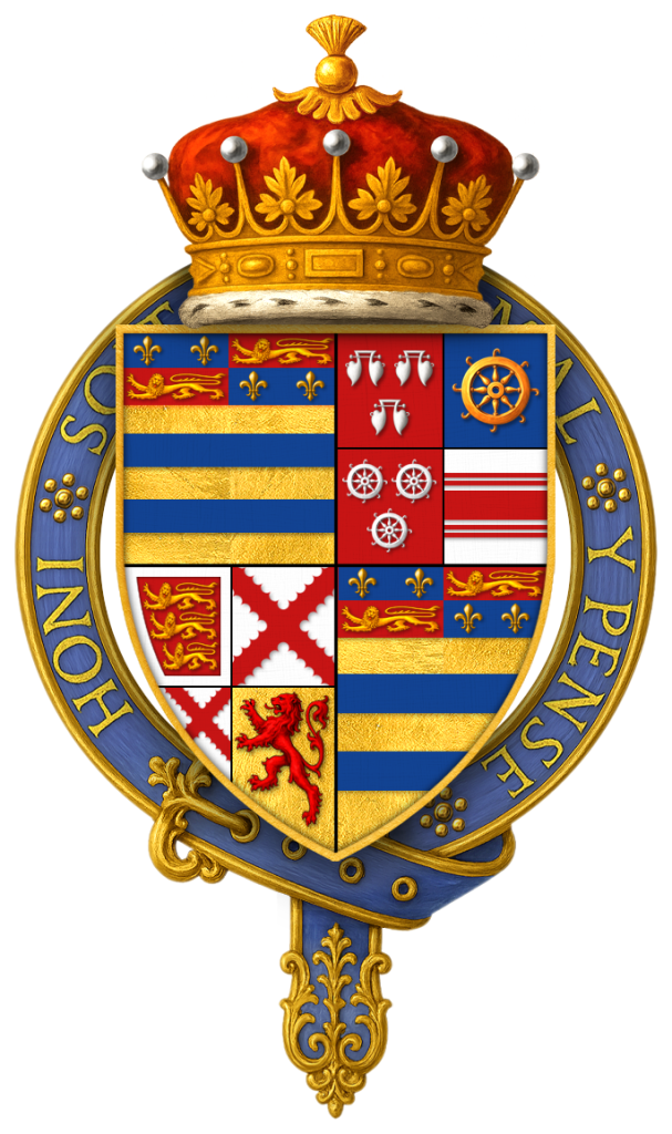 1 and 4, or, two bars azure, a chief quarterly of the last and gules, on the 1st and 4th, two fleurs-de-lis or, on the 2nd and 3rd, a lion passant gaurdant or (Manners);