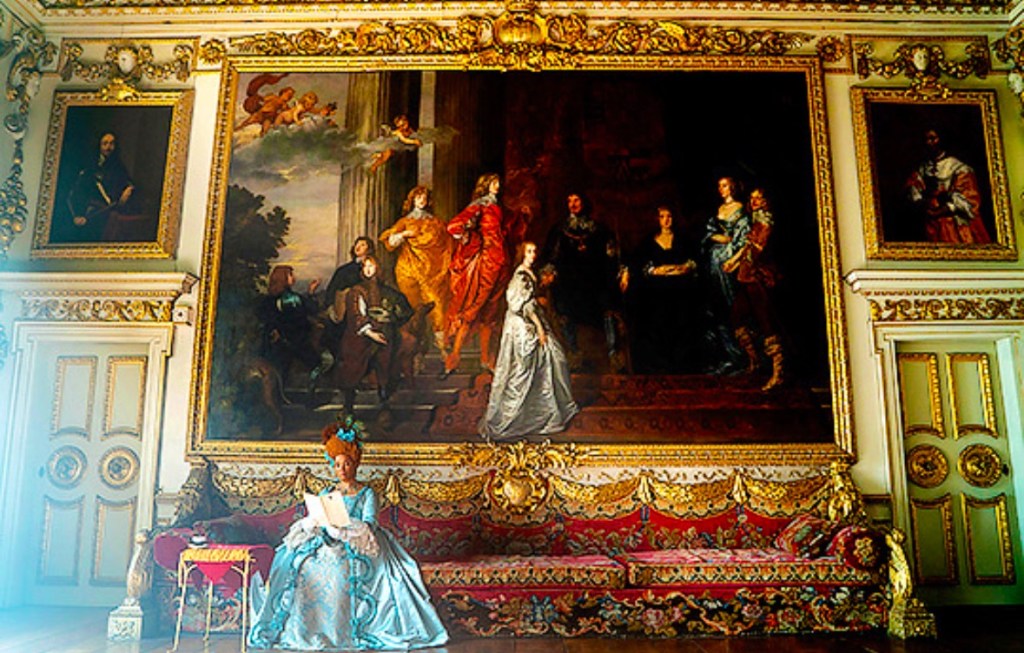 The character, Queen (consort) Charlotte of Mecklenburg-Strelitz, is seen in Wilton House reading in front of the portrait of the 4th Earl of Pembroke and his family by Anthony Van Dyck. Philip, Lord Pembroke, was a grandson of Lady Anne (Parr), Countess of Pembroke and her only husband, Sir William, 1st Earl of Pembroke.